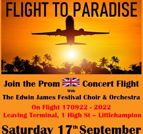 “Join us for our annual Prom concert, flight number 170922 leaving terminal 1 High Street, Littlehampton on 17th September 2022 at 7.30pm as the choir and orchestra take off in holiday mode. Gate number 1 opens at 6:45pm, please be seated by 7:15. Flight departs 7:30pm.”